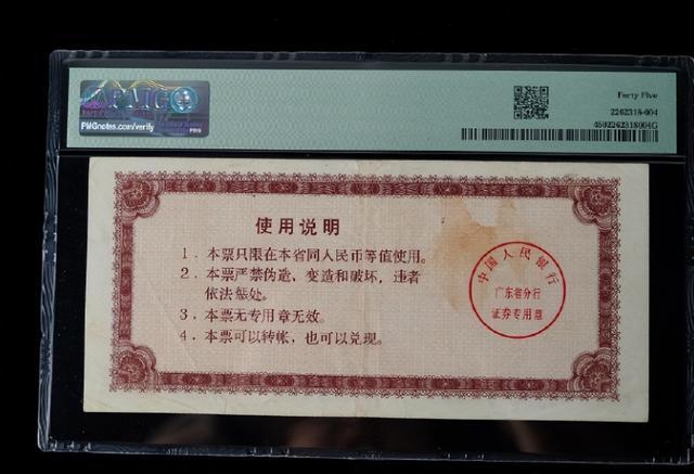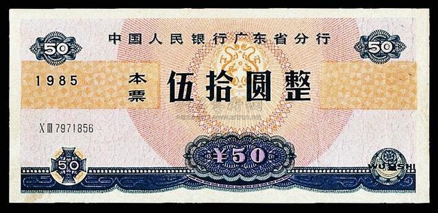 1985年2月4日,中国人民銀行广东省分行正式发行两种大额本票:50元(蓝色)和100元(紫色)。票面尺寸175mm×80mm,双面凹印,正面印着“中国人民銀行广东省分行”,背面右侧盖红色圆形“证券专用章”。